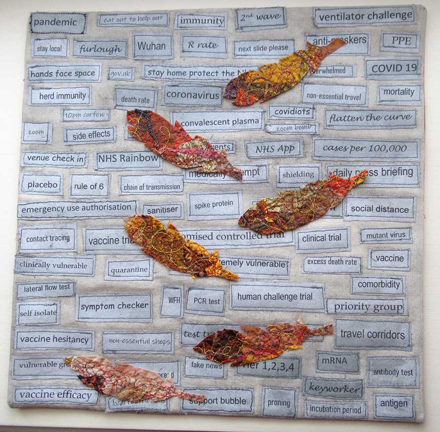 I used a variety of images that have significance to me, my home and Covid 19. I adapted ideas that I had wanted to experiment with for a long time. Lockdown and this project gave me that opportunity. Techniques I used include appliqué, English paper piecing-