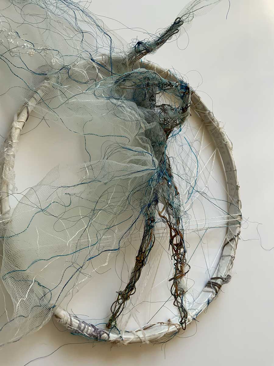 Living in an old cottage means that we are surrounded by history. Inside I discovered fragments of old wallpaper & paint colours whilst doing some decorating. Outside hours were spent working in the garden where I dug up many discarded pieces of broken blue & white china and the buttons. I decided to secure them onto a calico base using gold embroidery thread to emulate the Japanese Kintsugi method of repairing pottery. On my daily walks along old Drovers tracks I unearthed a couple of Shepherds crowns. The Kensitas embroidered pansy is a reference to the name of my home, Heartsease Cottage.