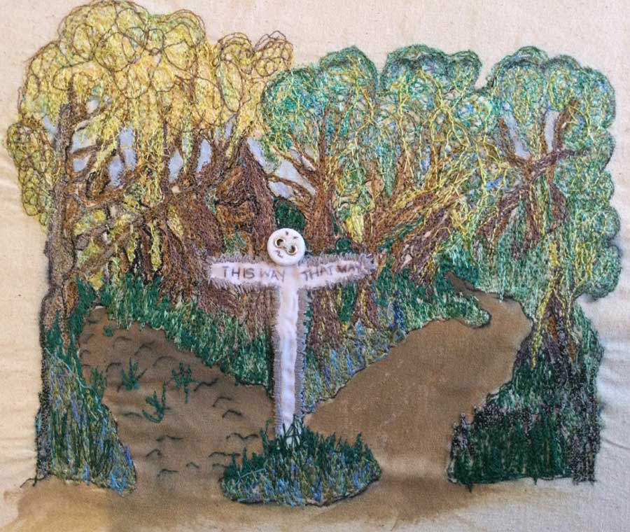 In the poem, nature around the home is an important feature along with the family members. To reflect this idea I have used photocopied images of pheasant feathers ‘ground nesting’ birds that regularly visit our garden. The feathers along with feather stitch form a protective frame around my textile picture with the home it’s centre. I embroidered over our signatures for posterity.