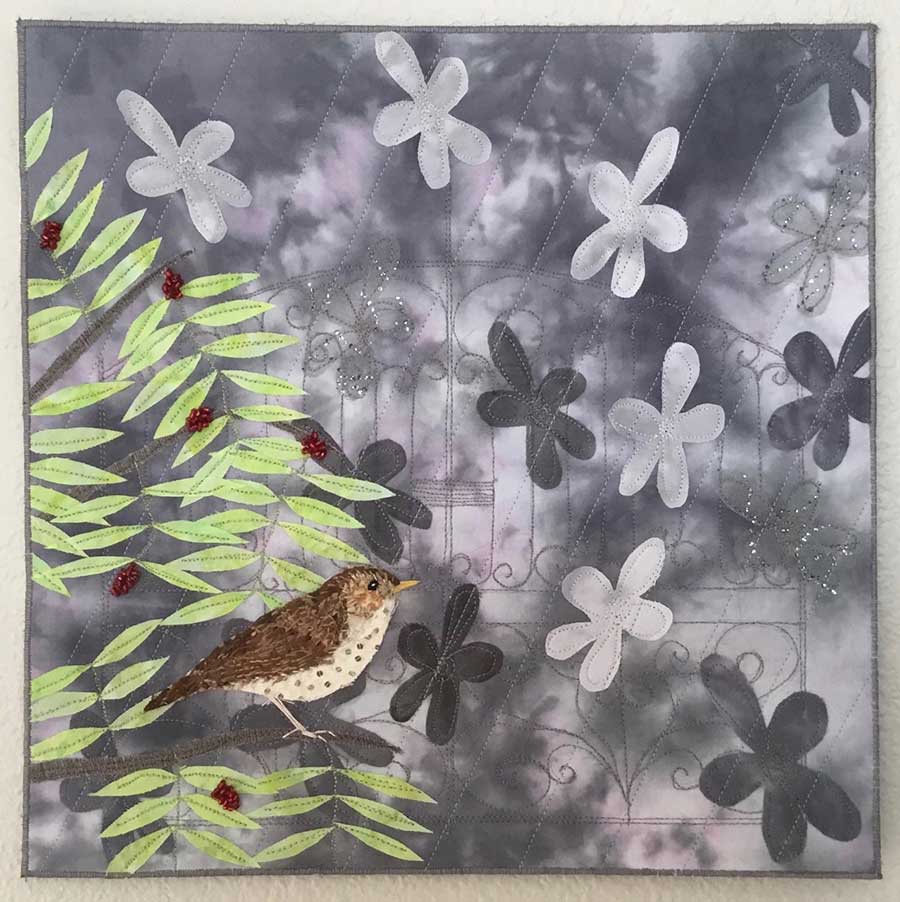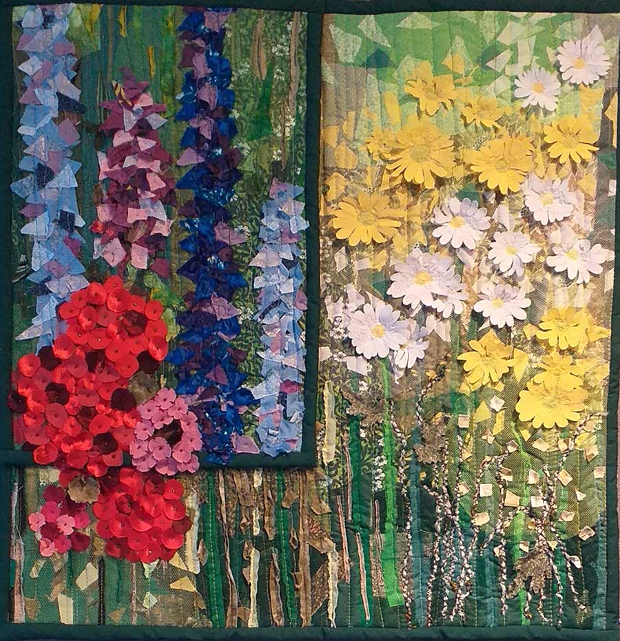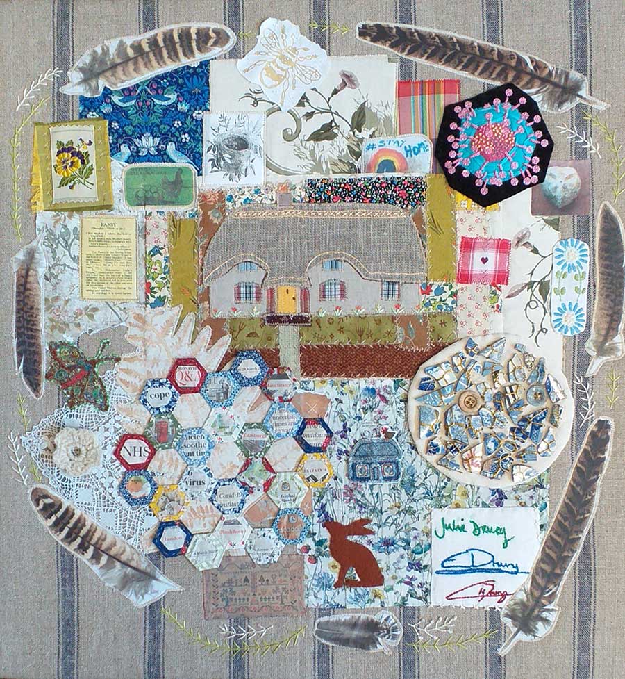 I used a variety of images that have significance to me, my home and Covid 19. I adapted ideas that I had wanted to experiment with for a long time. Lockdown and this project gave me that opportunity. Techniques I used include appliqué, English paper piecing-
