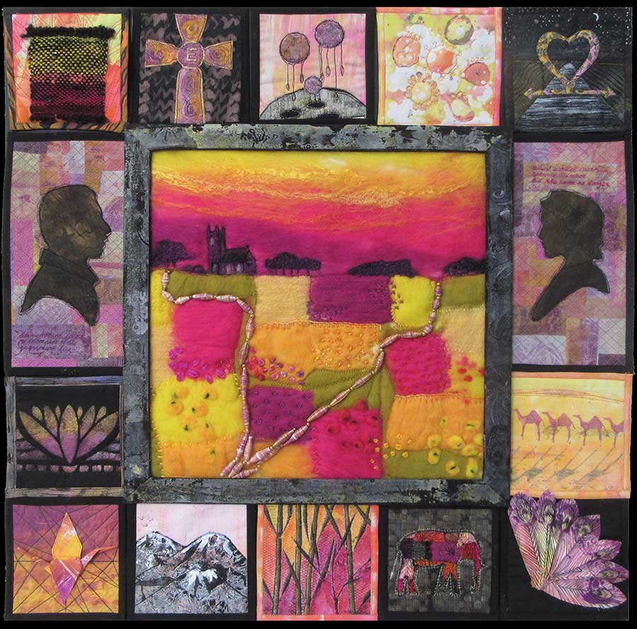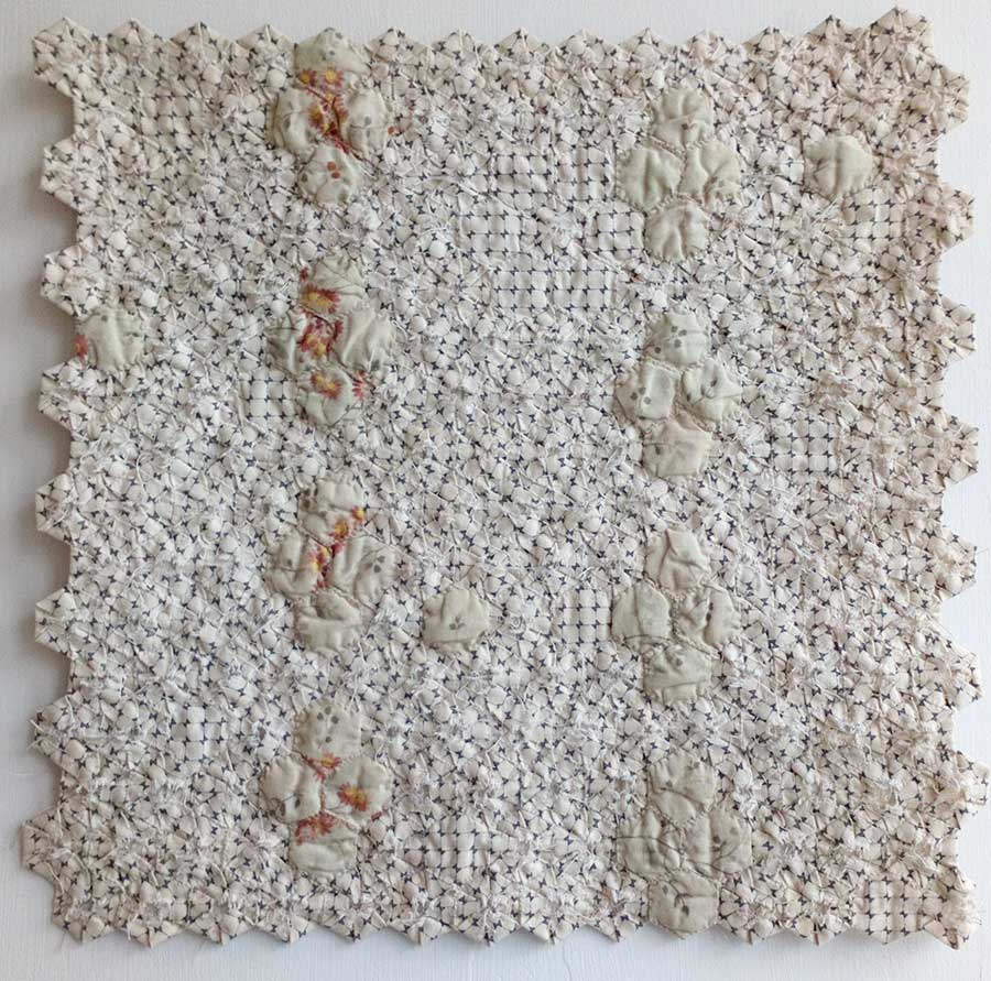 Living in an old cottage means that we are surrounded by history. Inside I discovered fragments of old wallpaper & paint colours whilst doing some decorating. Outside hours were spent working in the garden where I dug up many discarded pieces of broken blue & white china and the buttons. I decided to secure them onto a calico base using gold embroidery thread to emulate the Japanese Kintsugi method of repairing pottery. On my daily walks along old Drovers tracks I unearthed a couple of Shepherds crowns. The Kensitas embroidered pansy is a reference to the name of my home, Heartsease Cottage.